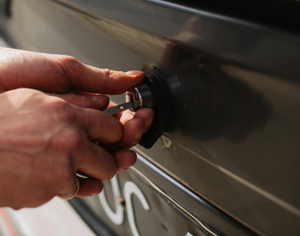 • Coat Hanger Method (for older manual locks): Carefully slide the hook inside to lift the lock.